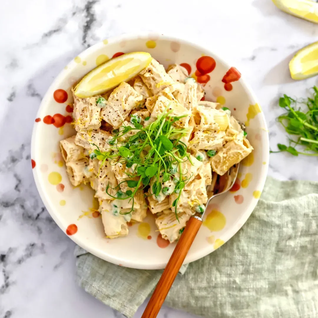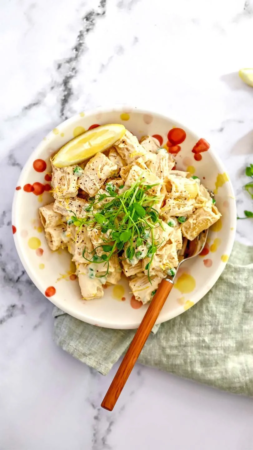 This pasta is the epitome of a satisfying meal that feels indulgent yet is secretly packed with nutrients. The creamy sauce is made from a blend of cashew nuts and tofu, giving it that rich, velvety texture without any dairy—perfect for those who are lactose intolerant or just looking to reduce their dairy intake. Plus, adding green peas and a splash of lemon juice adds a burst of freshness and a pop of colour that's sure to brighten up any plate.