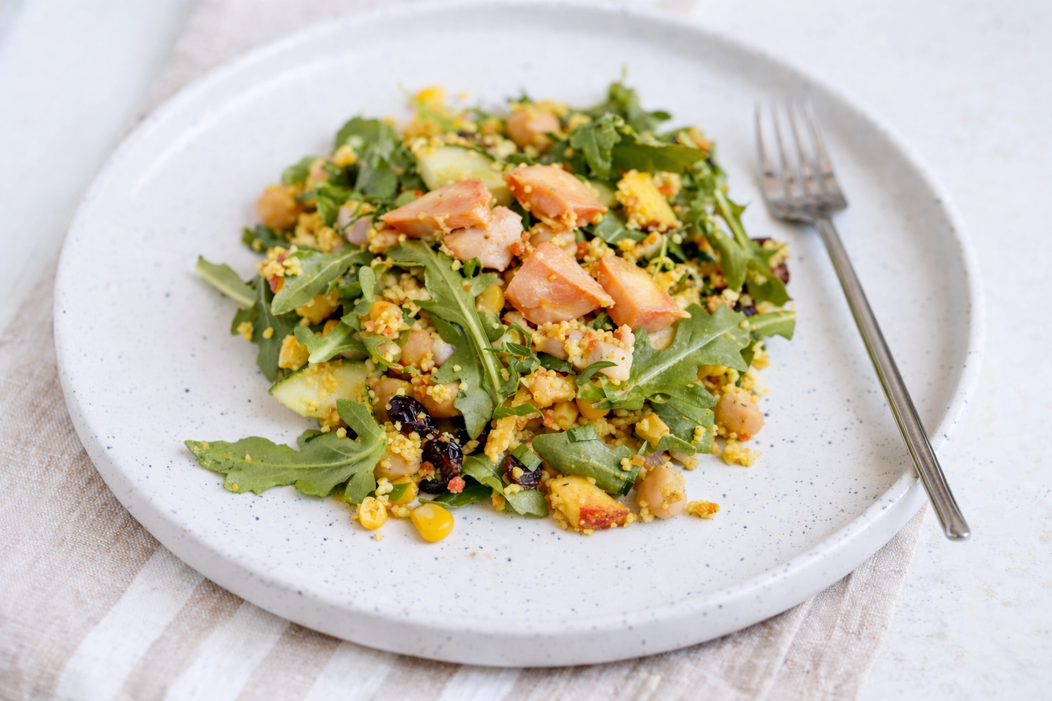 To serve, arrange a generous handful of rocket on each plate and spoon the couscous salad over the top. Alternatively, fold the rocket directly through the salad just before serving if you prefer.